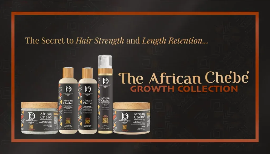 De Afrikaanse Chébé Gowth Collection is een uit meerdere stappen bestaand systeem dat de groei bevordert door de haarschubbenlaag te versterken, intensief te hydrateren en het breken van pluizig en krullend haar te verminderen.